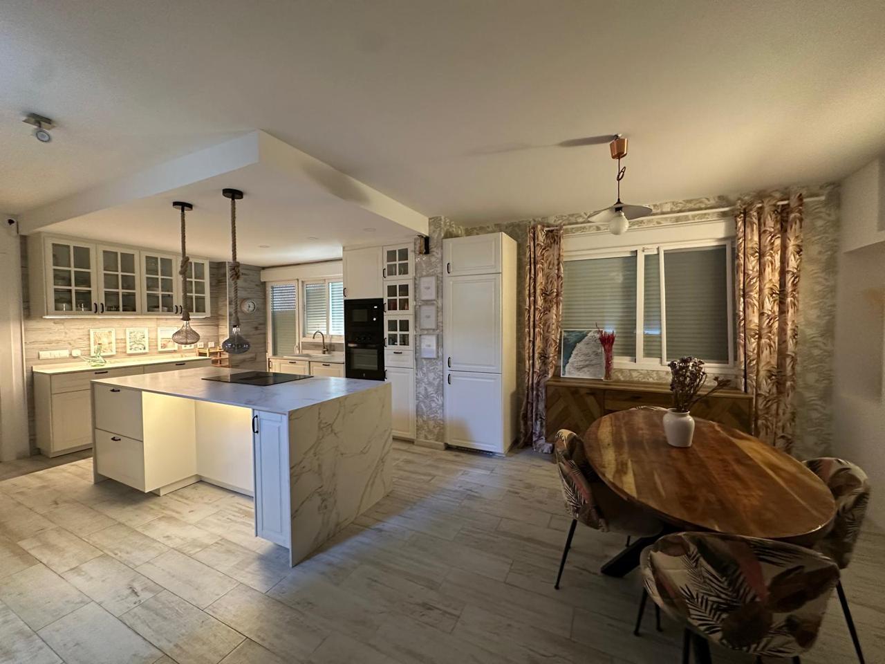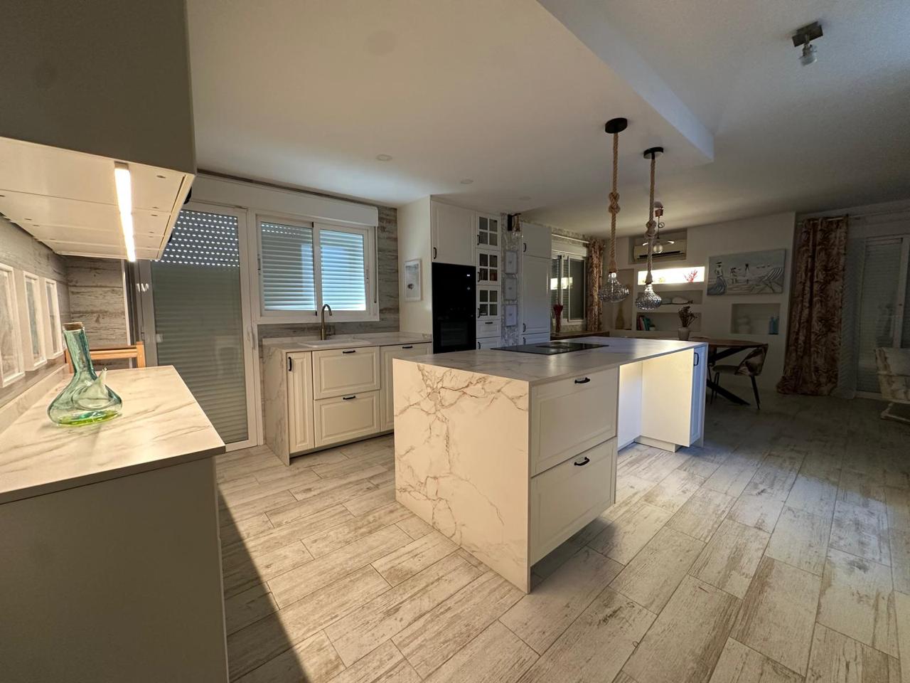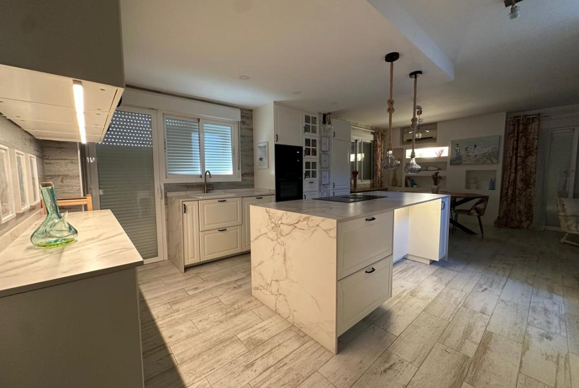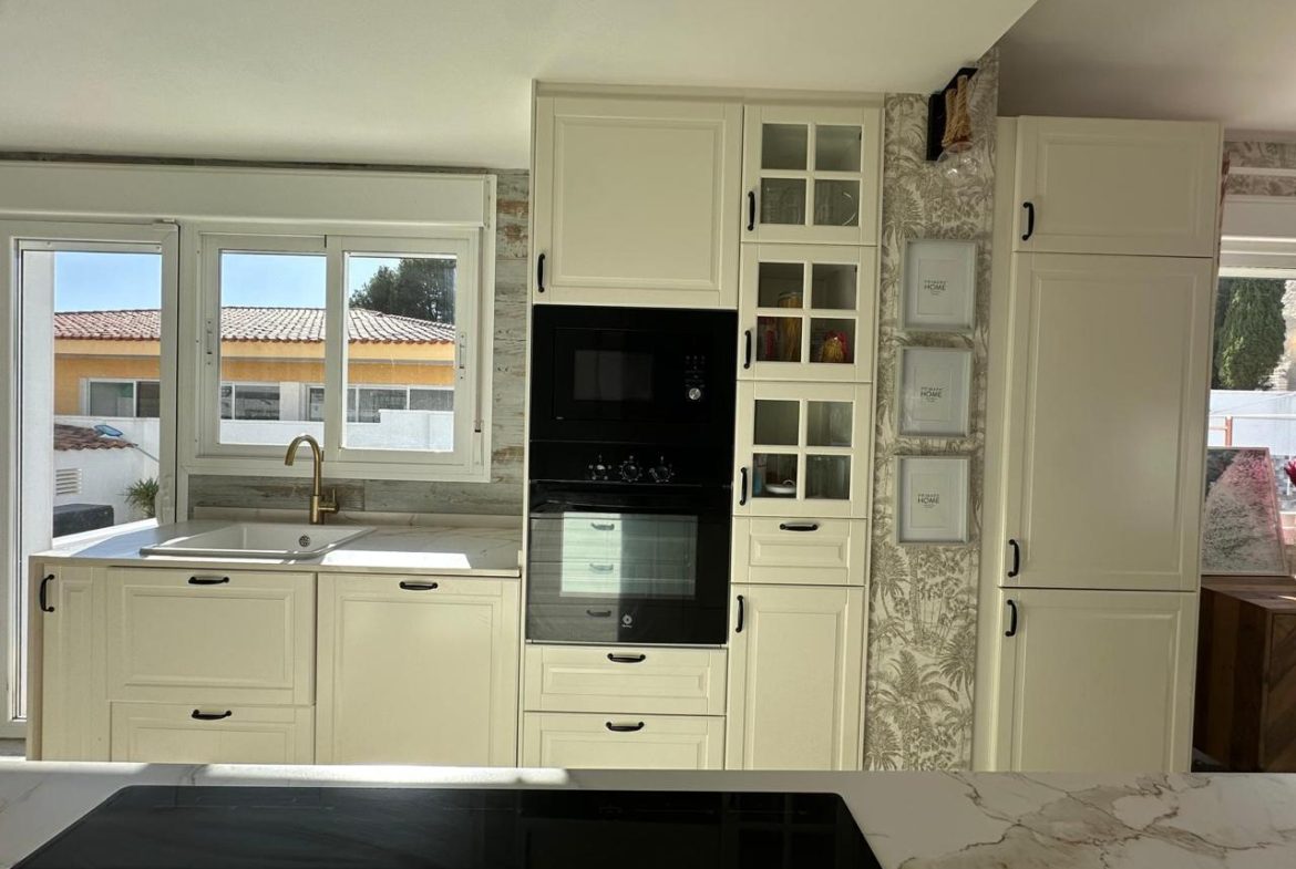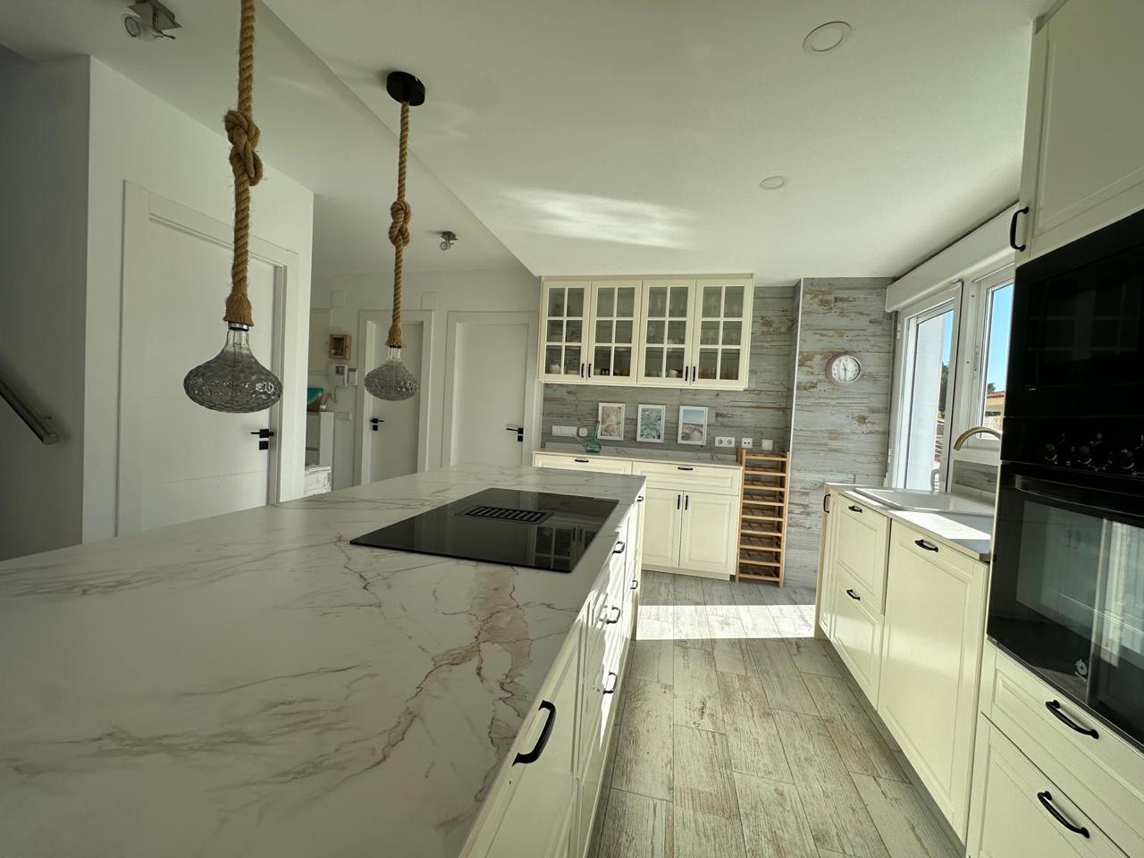La cocina, completamente renovada hace apenas dos años, combina diseño y funcionalidad con acabados de alta gama, una espectacular isla central de 2,50 x 1,04 metros y electrodomésticos integrados: vitrocerámica de inducción con campana extractora integrada, horno, microondas y lavavajillas.