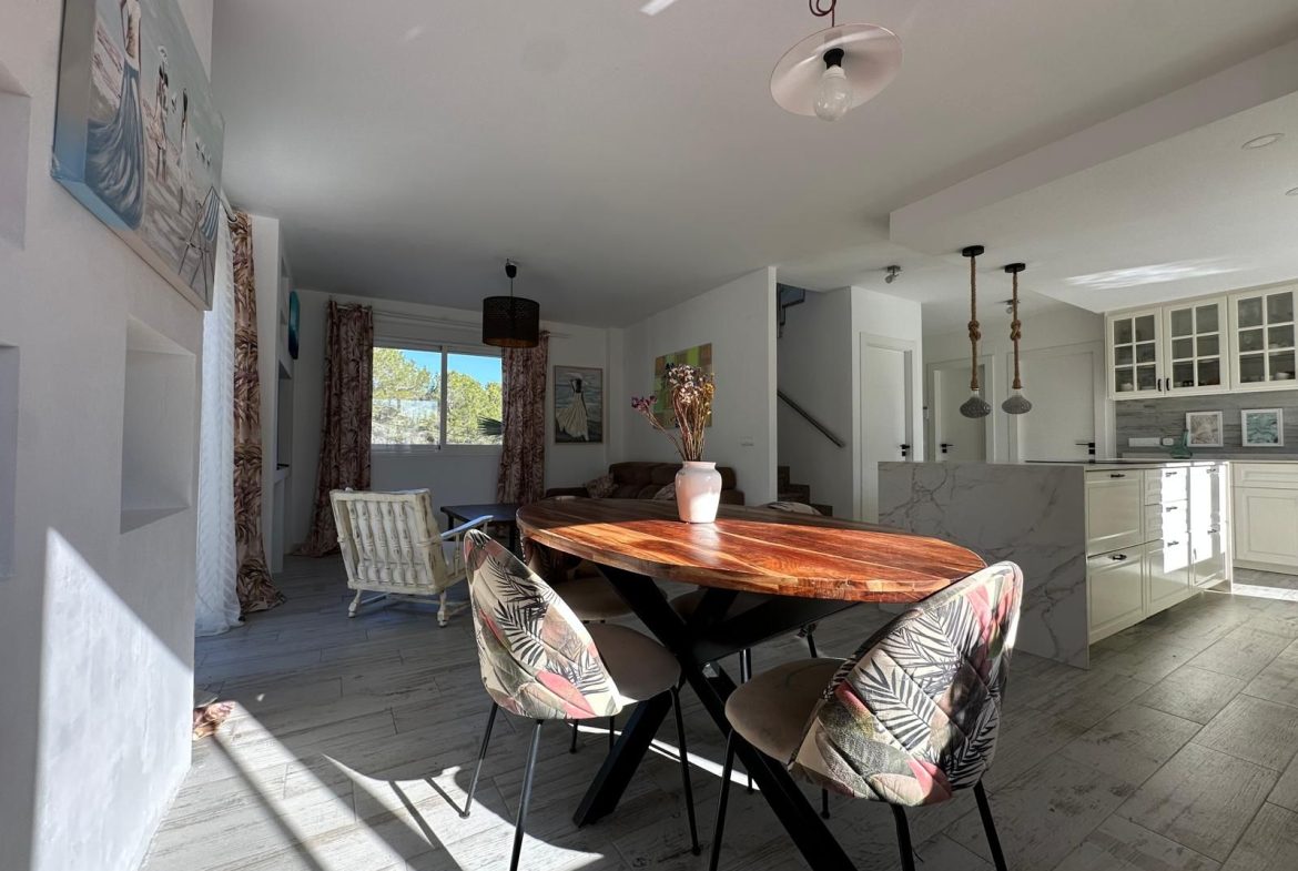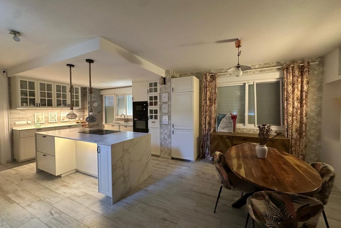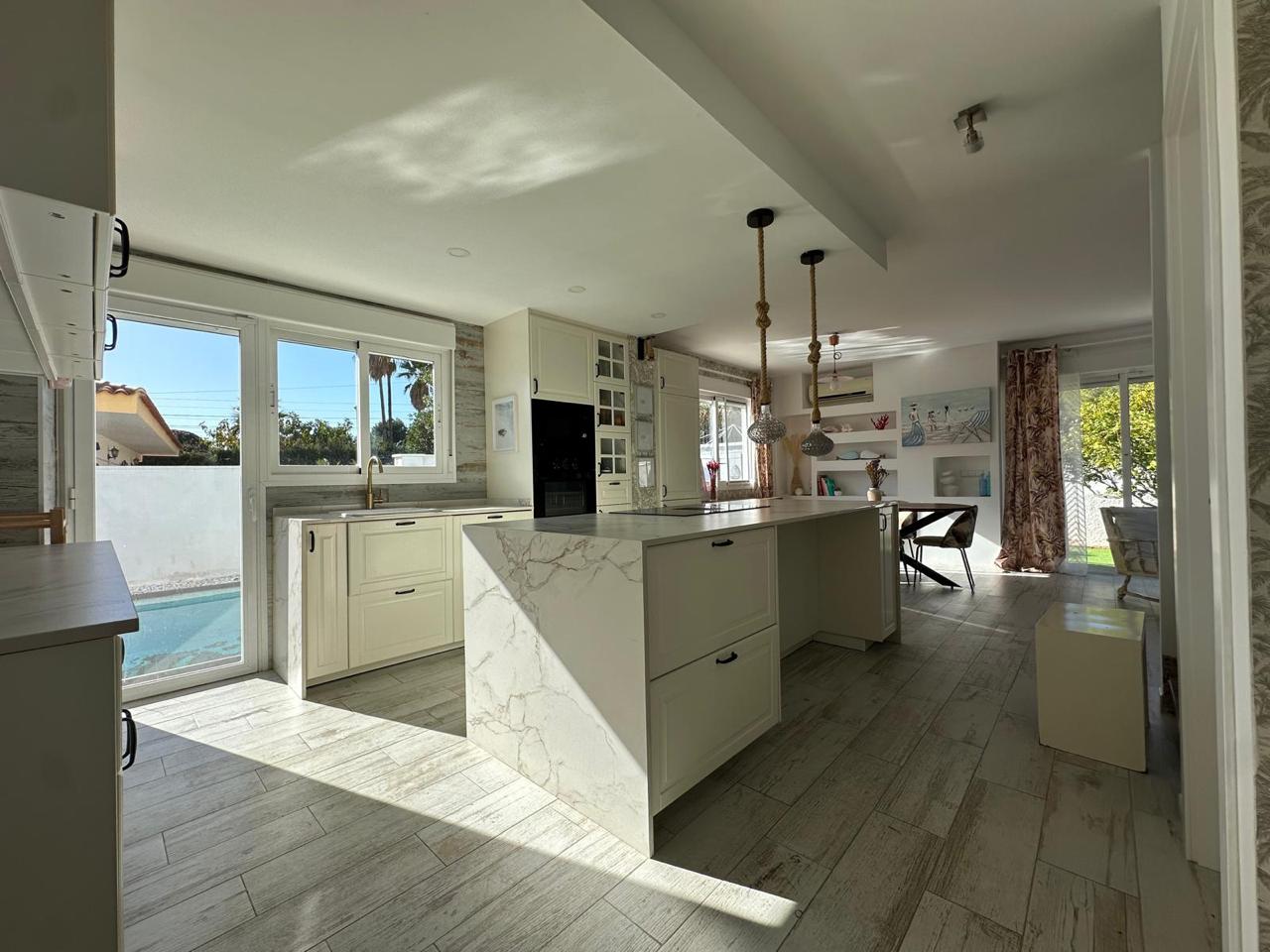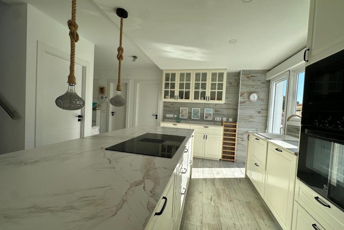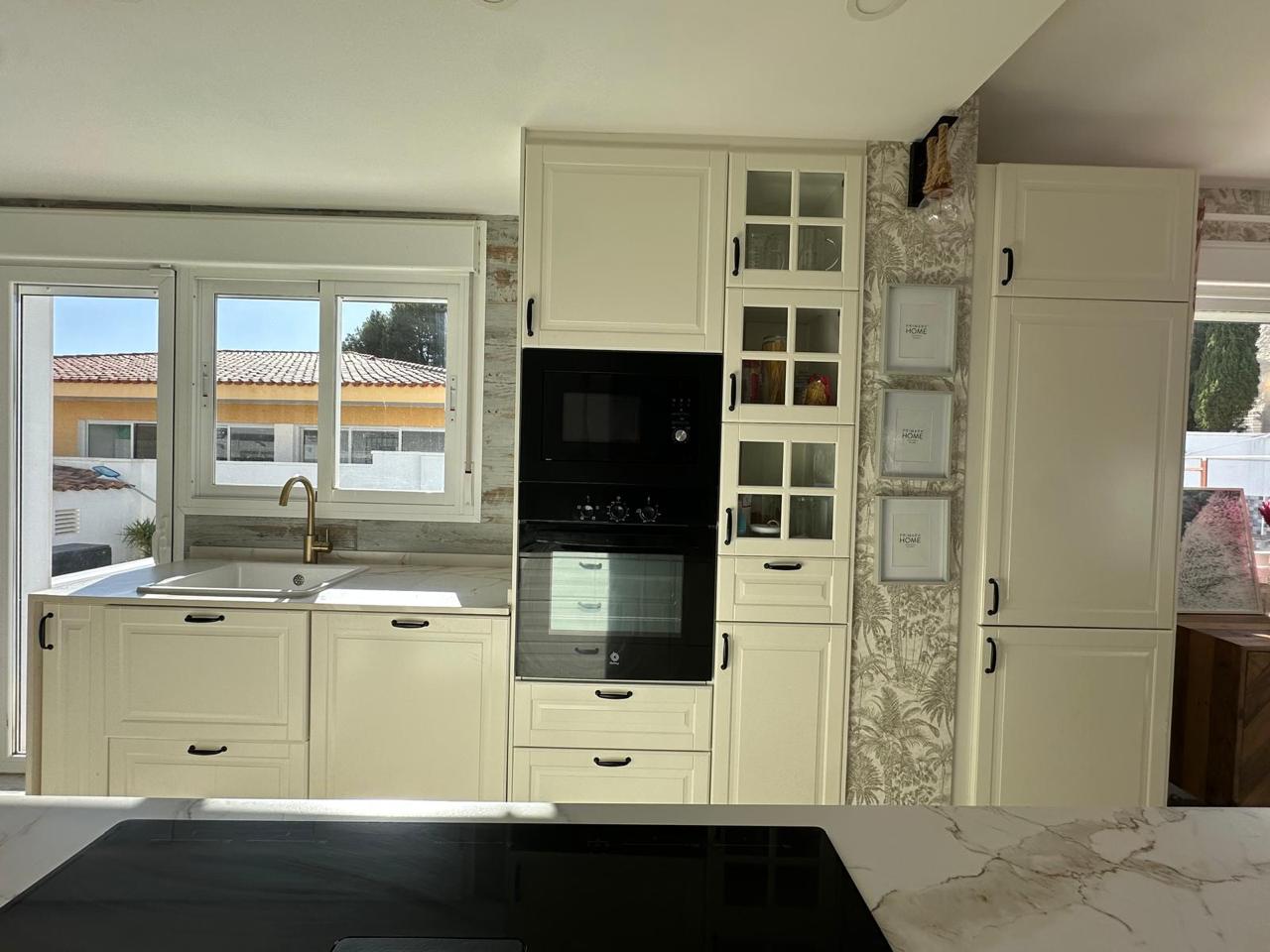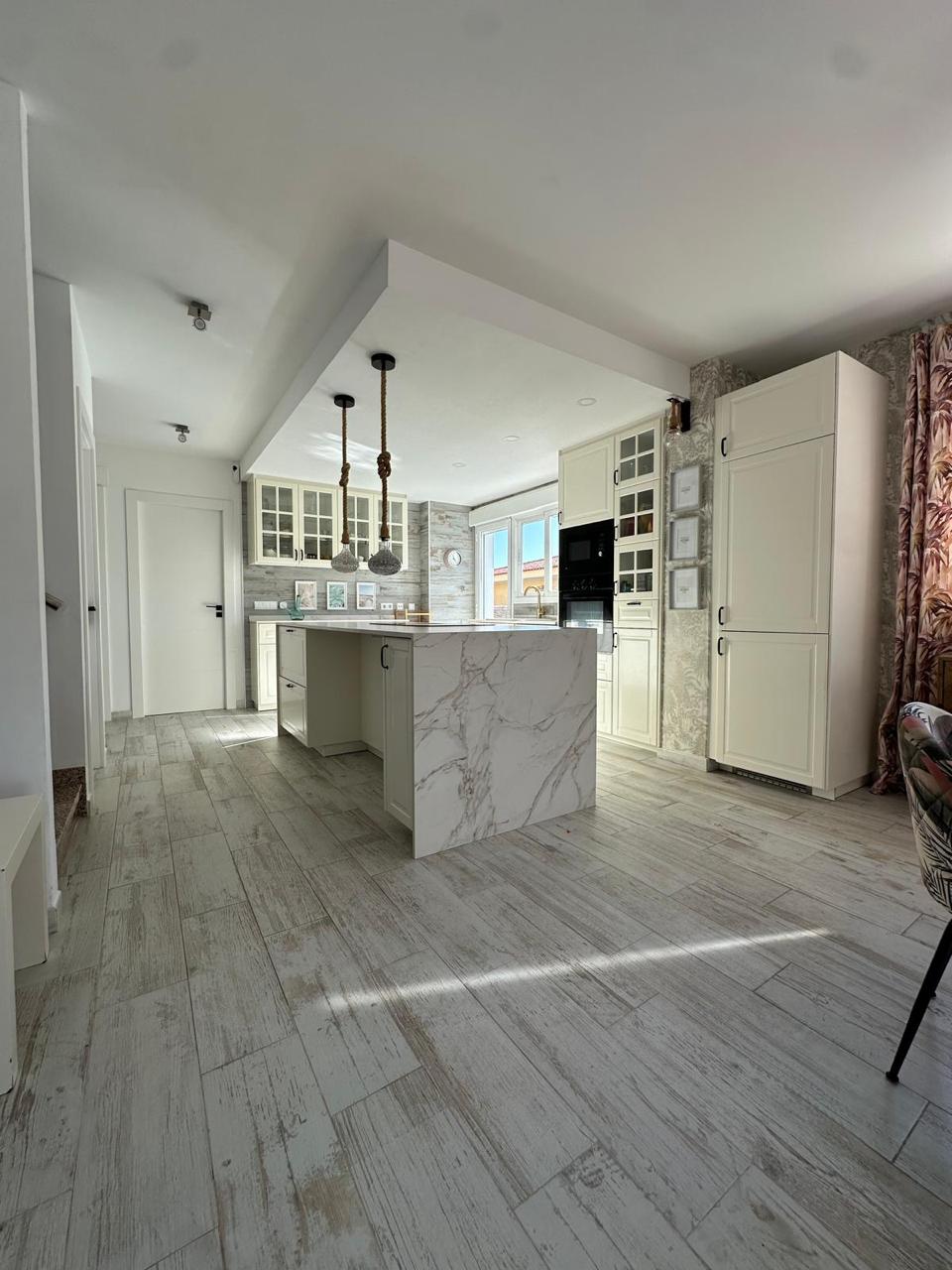 La cocina, completamente renovada hace apenas dos años, combina diseño y funcionalidad con acabados de alta gama, una espectacular isla central de 2,50 x 1,04 metros y electrodomésticos integrados: vitrocerámica de inducción con campana extractora integrada, horno, microondas y lavavajillas.