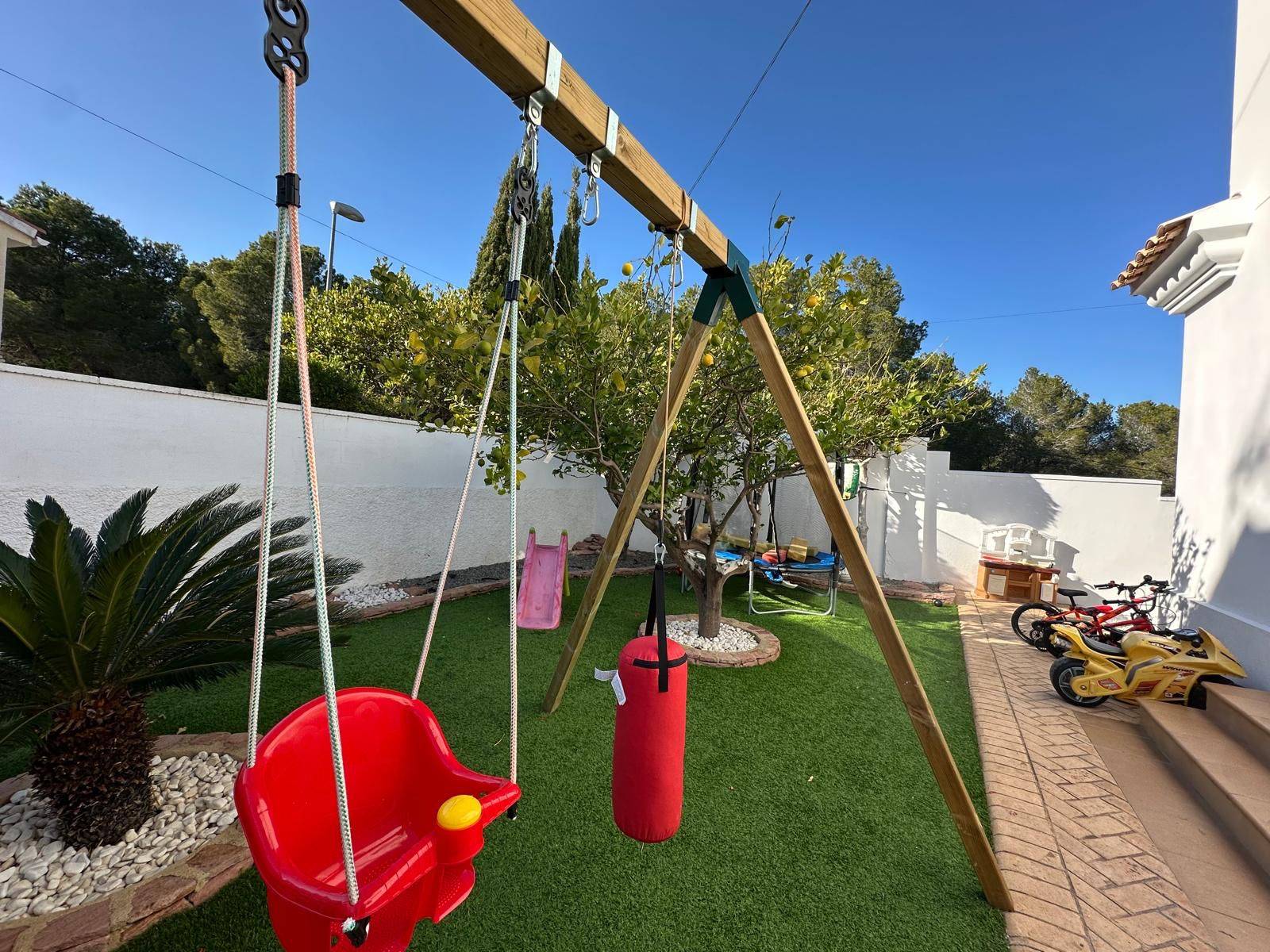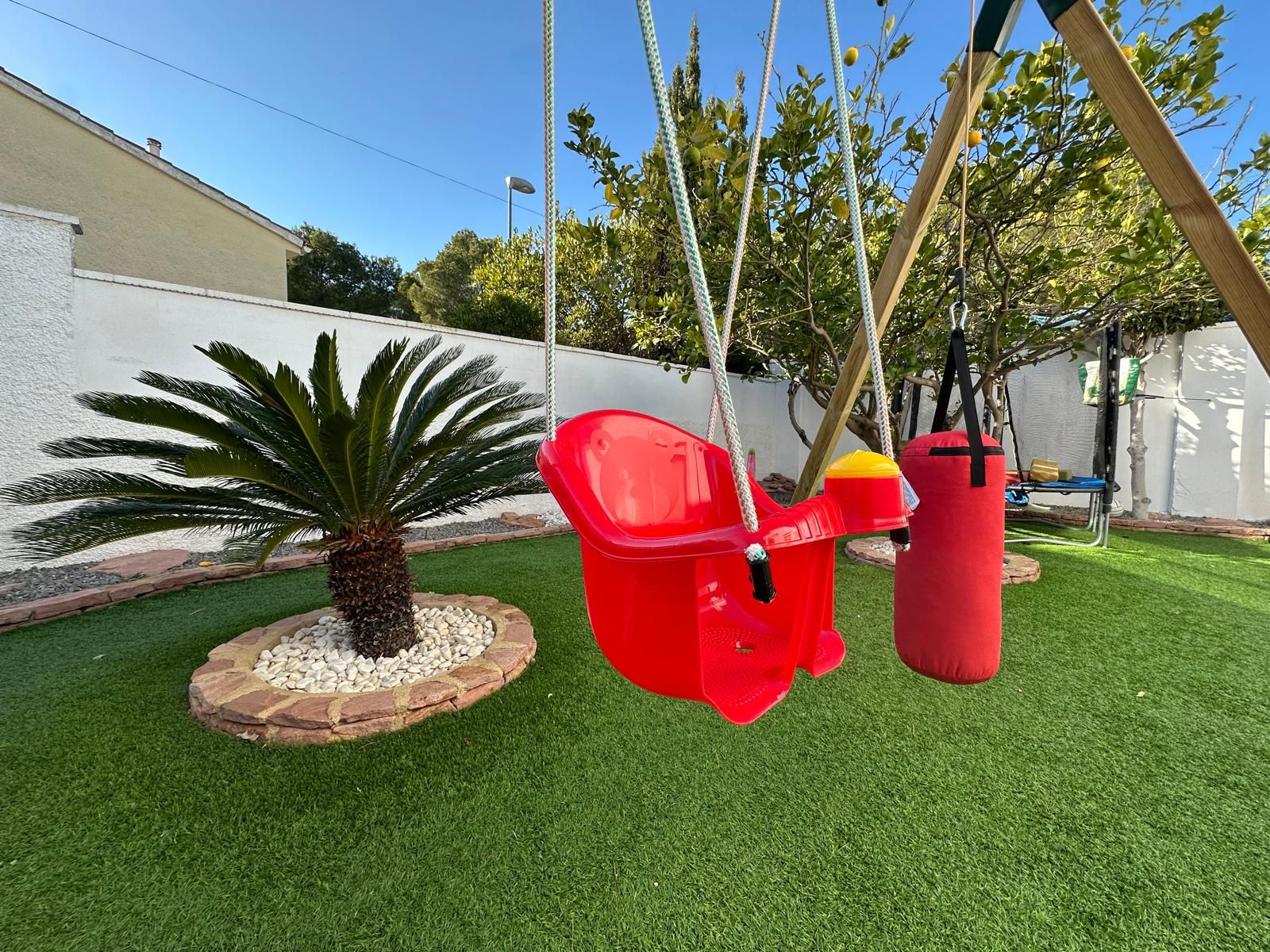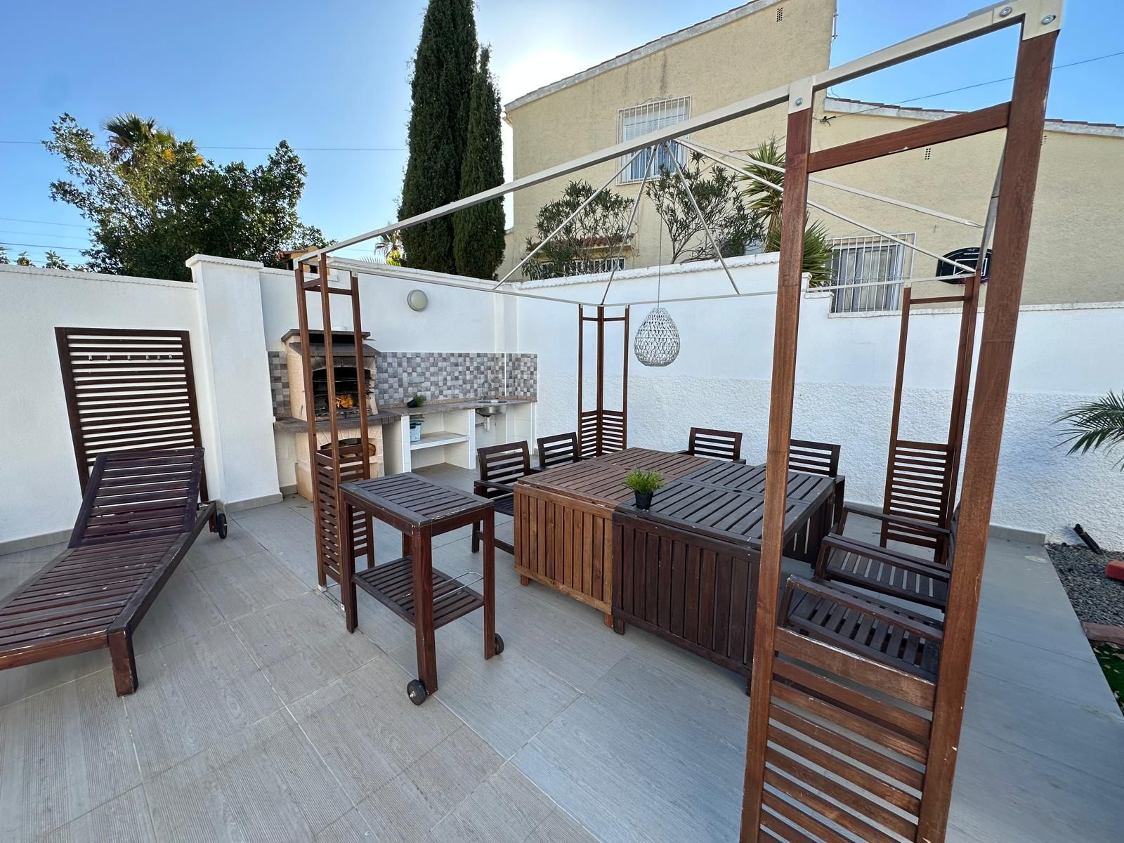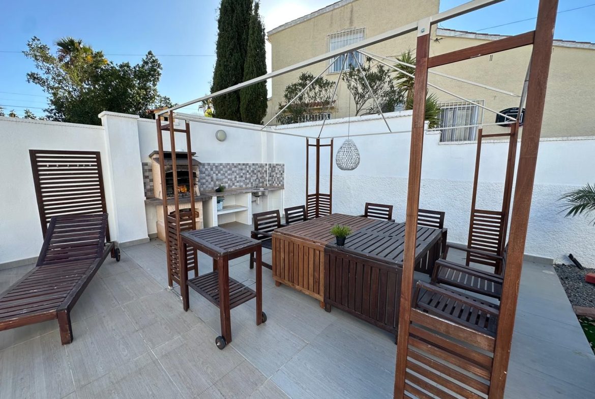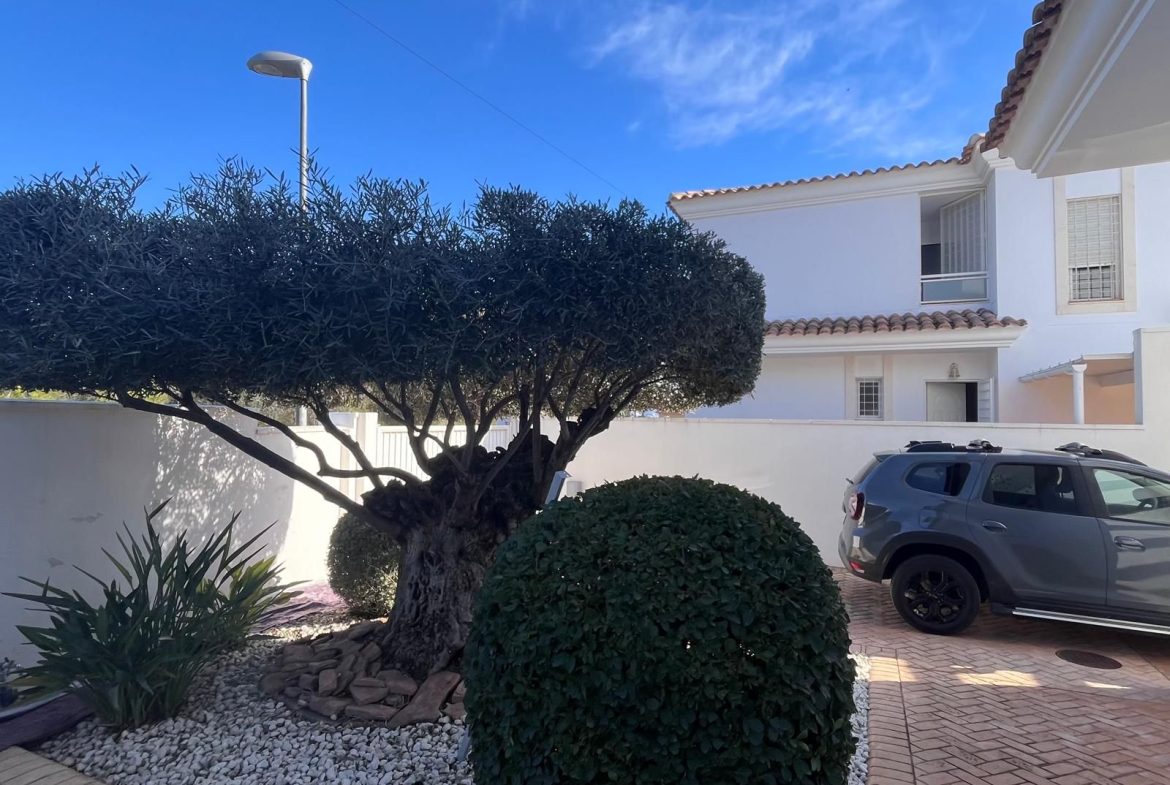 La vivienda está equipada con placas solares, sistema de climatización por bomba de frío/calor en todas las estancias, mosquiteras, parking privado para dos vehículos con puerta automática, caseta de herramientas y un cuidado jardín con zona de barbacoa, mesas, tumbonas y un majestuoso olivo junto a las palmeras que embellecen la entrada.