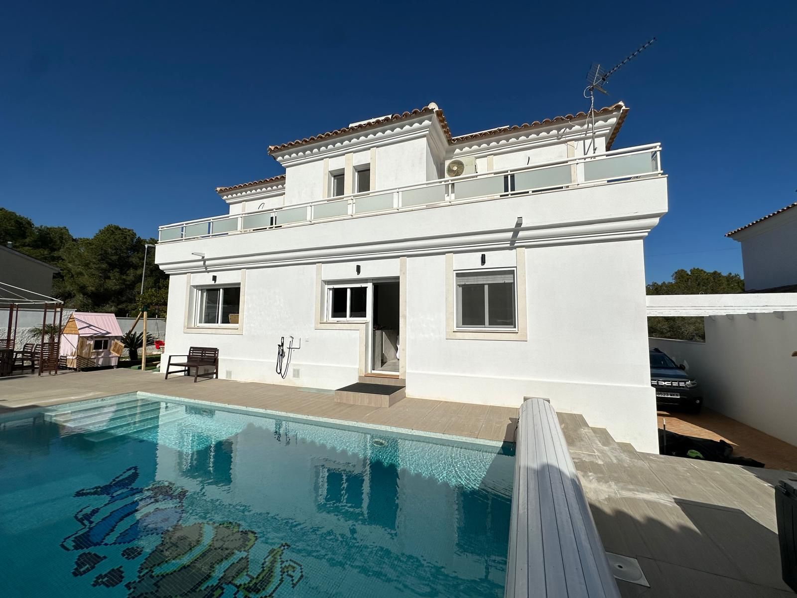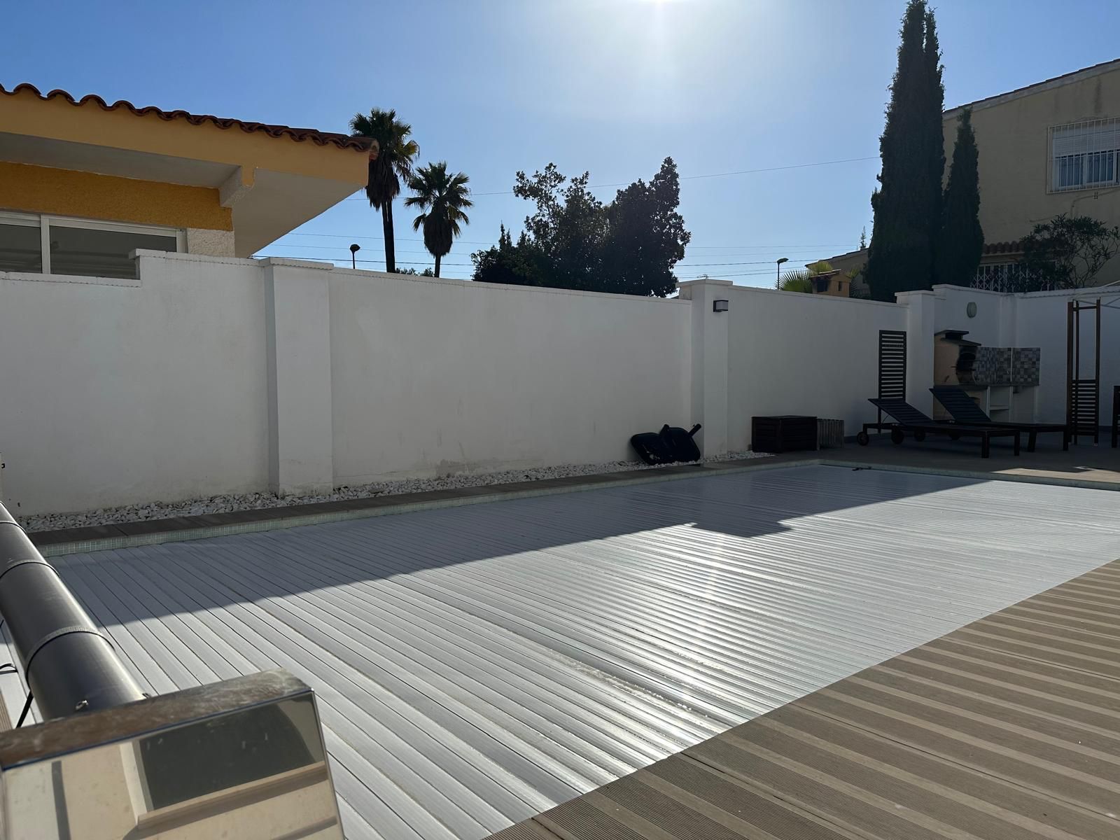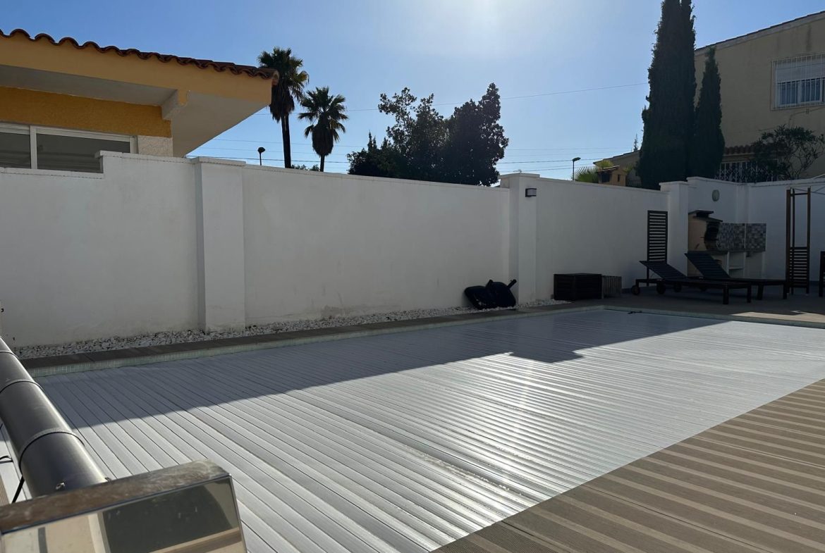 En el exterior, destaca una piscina de agua salada de 8×4 metros con cubierta enrollable motorizada, perfecta para disfrutar todo el año. La terraza superior conecta dos de los dormitorios, ideal para relajarse al atardecer.